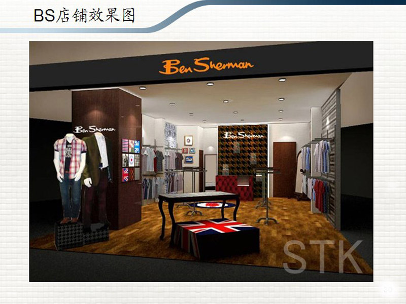 Ben Sherman以制作手工艺衬衫起家,缝纫方法受到尖锐时髦意大利风的影响,漂亮好看的Ben Sherman 衬衣成为那个时代 Mod 族年轻人们的必需品。时装界每隔数年的Mod风格回潮都会有无数品牌翻炒。Ben Sherman的经典设计,影响了几乎所有的英国乐队和歌手。Beatles都是他的忠实客户。时至今日, Ben Sherman仍是英国流行乐队的首选品牌。 本案例以黑色为主,搭配褐色木板、土黄色地板时不时地显露出该品牌特有的格调和 韵味。